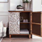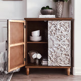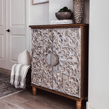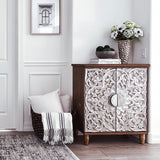 Transform your living room space with this stunning retro accent cabinet, featuring intricate carved rustic accents and an elegant silver flower design. Perfectly suited for shabby chic or vintage-themed interiors, this cabinet serves as both a functional storage solution and a striking statement piece. Its versatile functionality ensures that it enhances the beauty of any room while providing necessary storage.