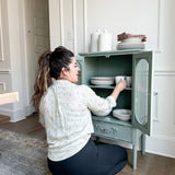 Are you looking for a charming small sideboard that adds personality to your home without taking up too much space? This stunning piece, finished in a warm mint green and adorned with delightful floral designs, is perfect for showcasing your dinnerware or cherished decorations. With its stylish appearance and practical storage solutions, it brings charm and elegance to any dining room or living area. No matter where you place it, this sideboard is sure to become a standout feature in your home!